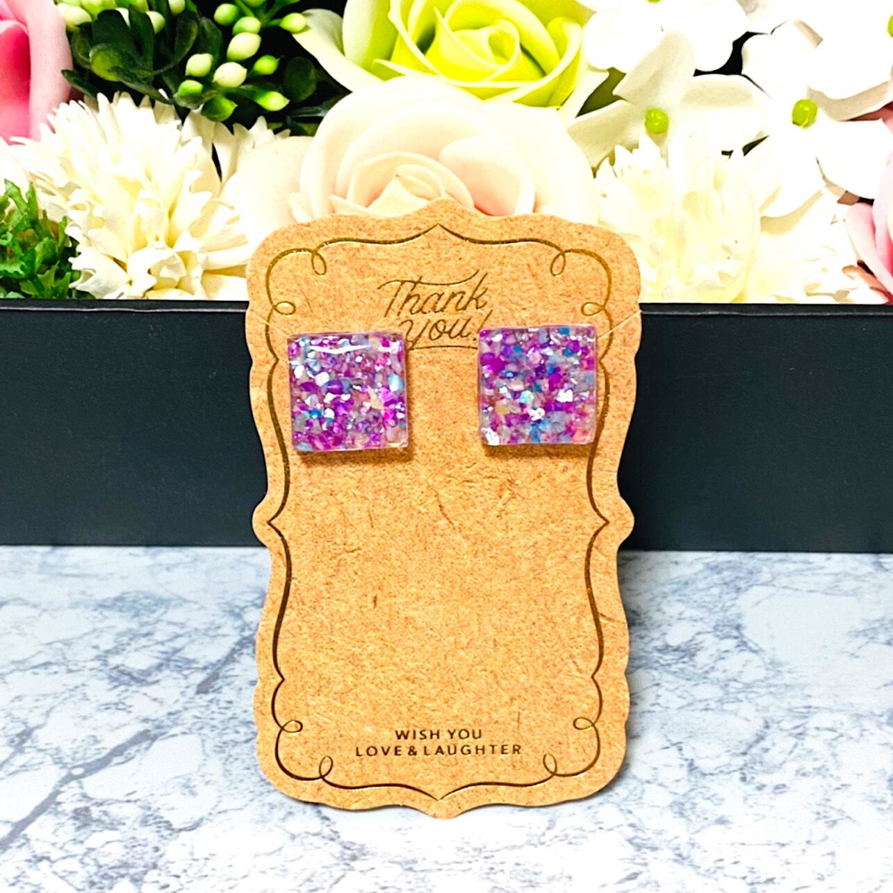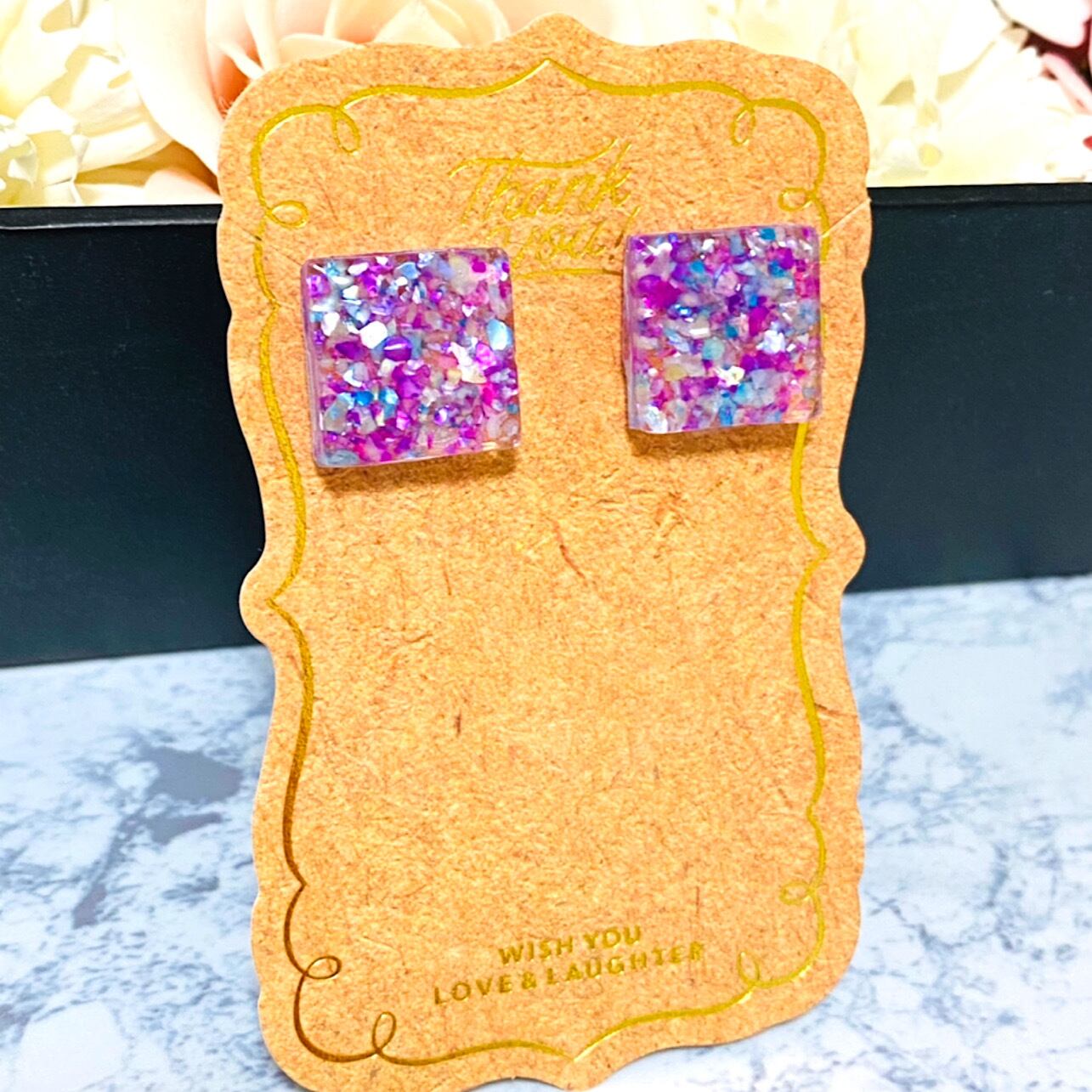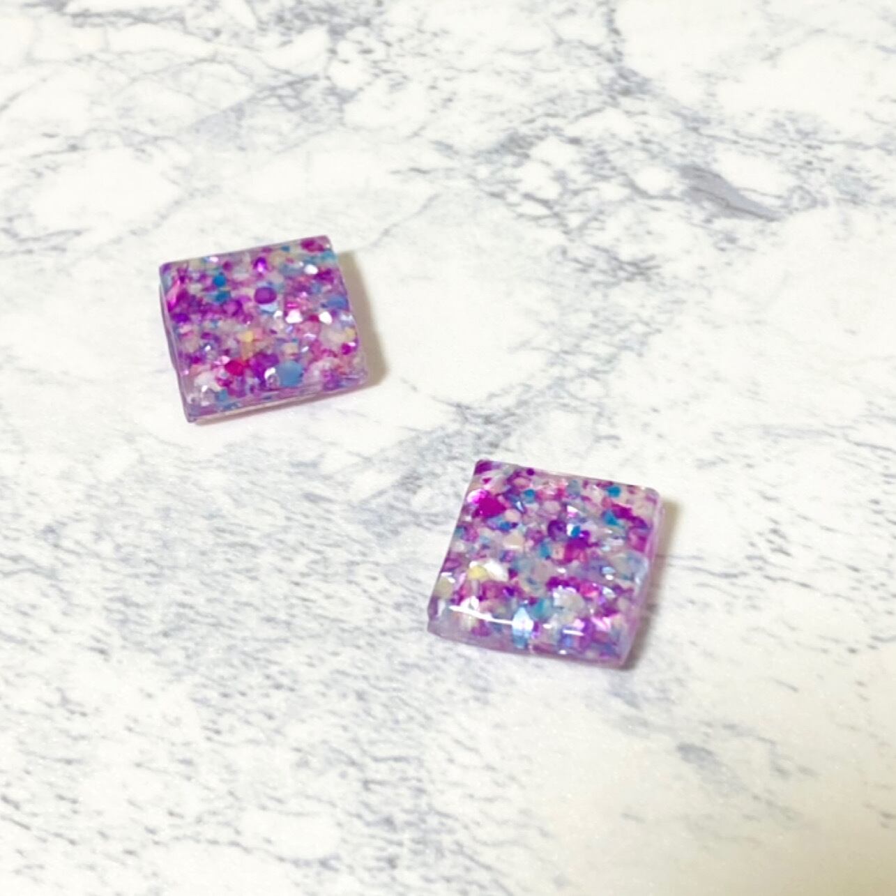 レジンの中に紫をベースとしたシェルが散りばめられてます♡♡凄く綺麗でシンプルで耳に付けた時に凄く可愛いです。