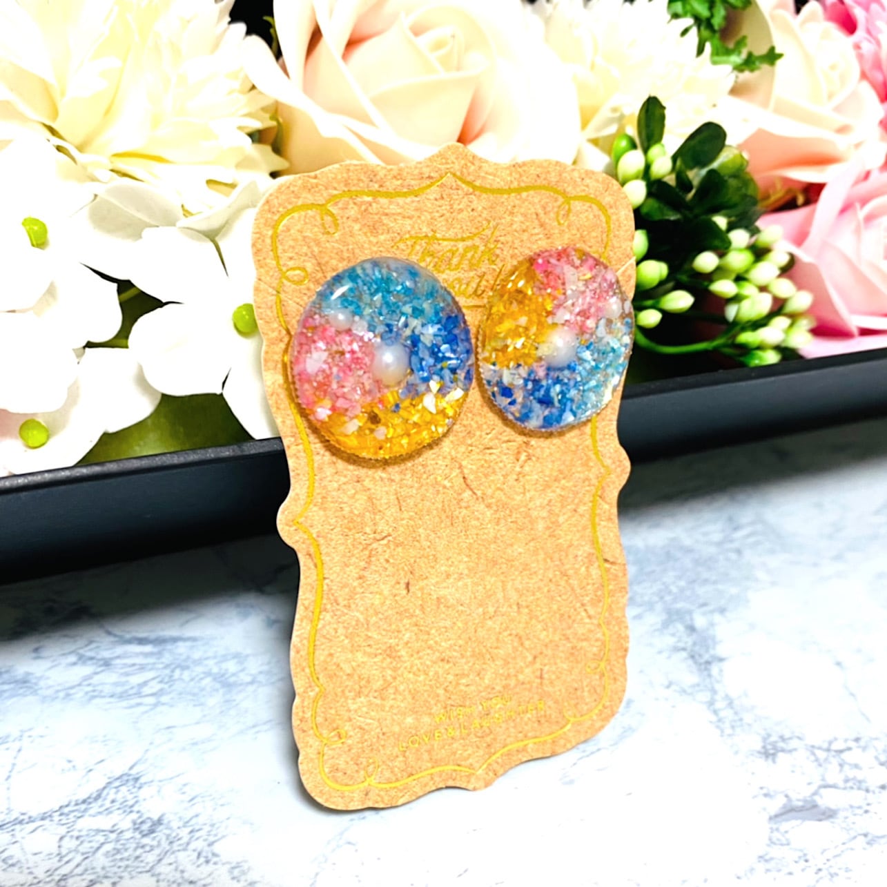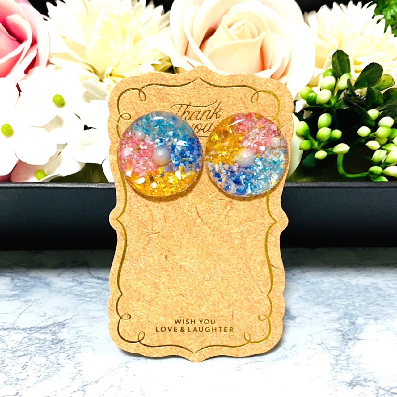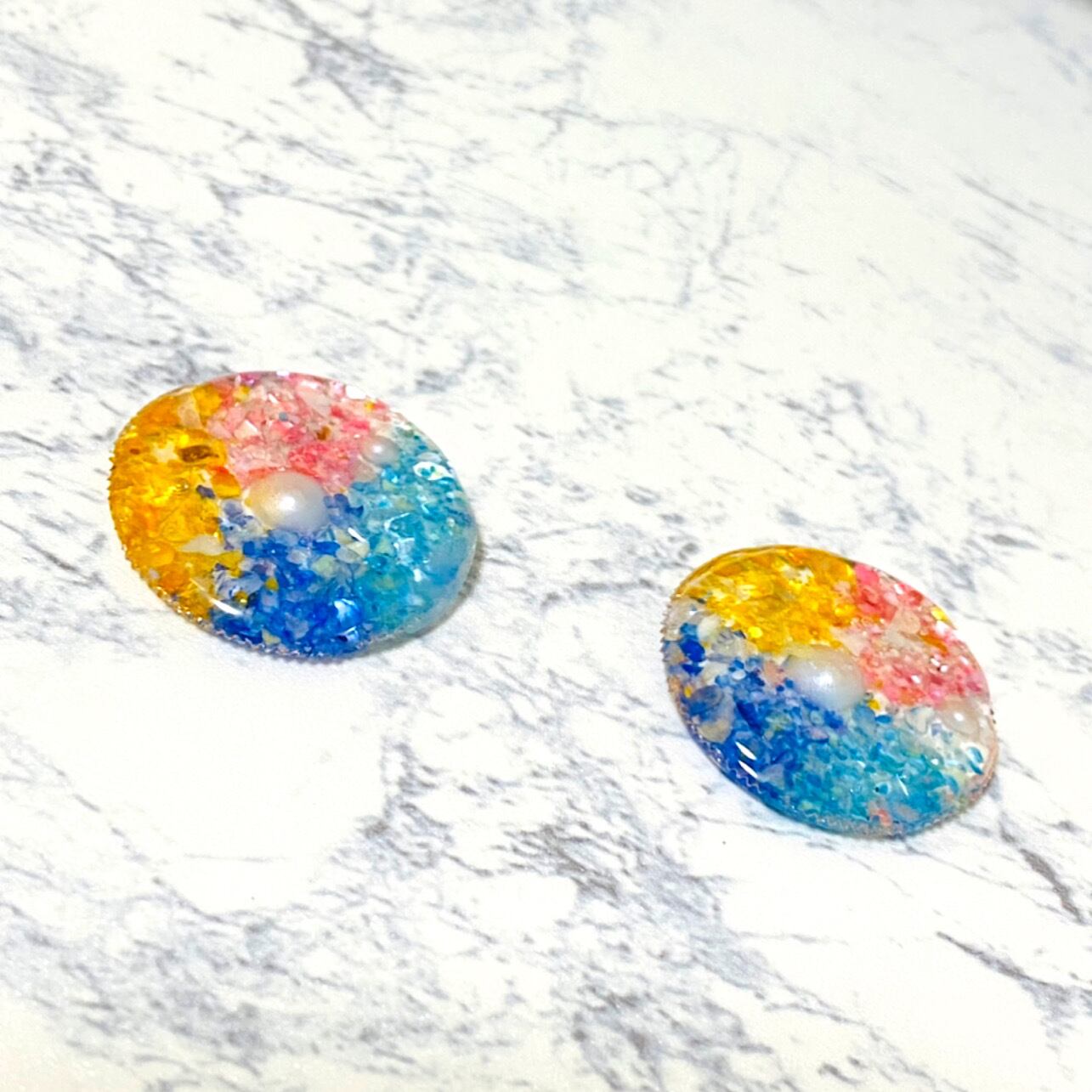 丸い型の中に、カラフルなシェルと真ん中にはパール。夏らしくてとても可愛いです*ˊᵕˋ**ˊᵕˋ*